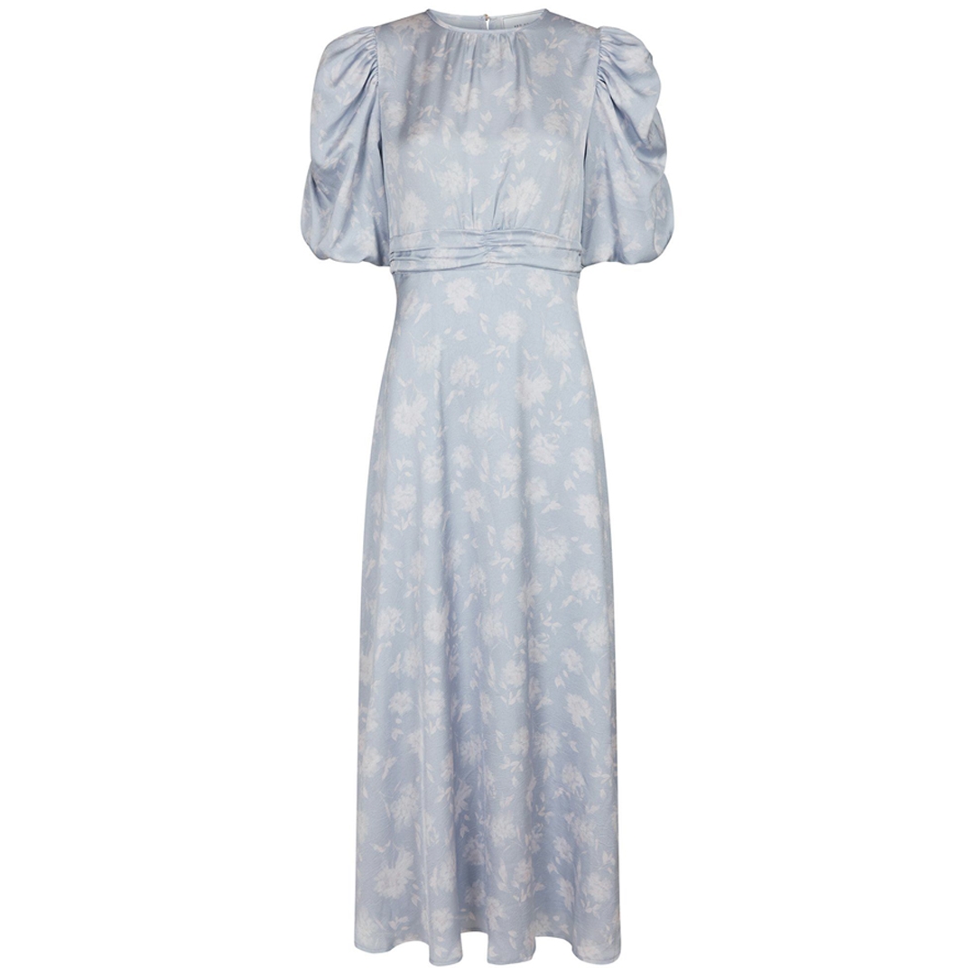 Fin Kikka Faded Flower kjole designet i en skinnede satinkvalitet med romantisk blomsterprint
