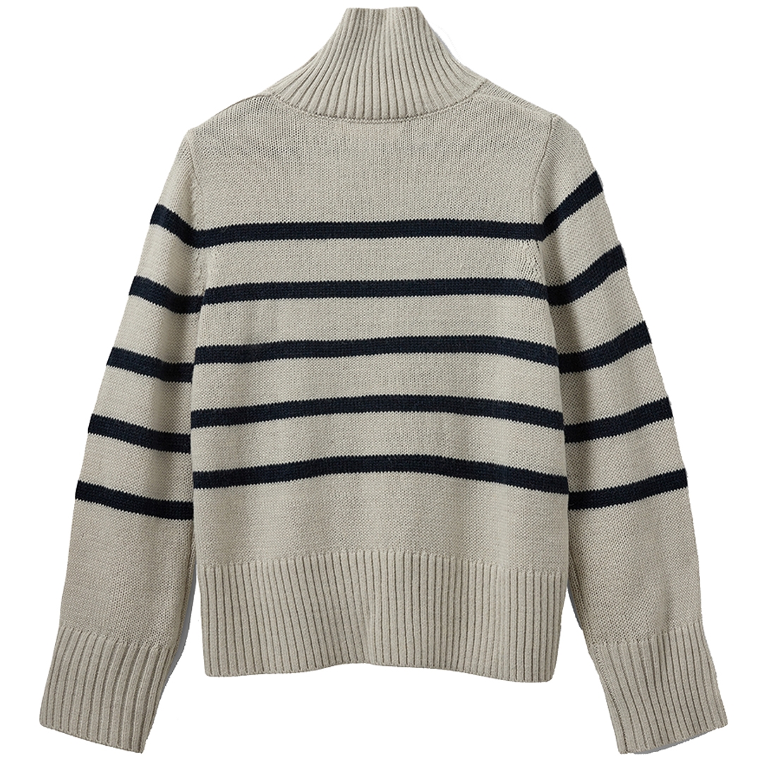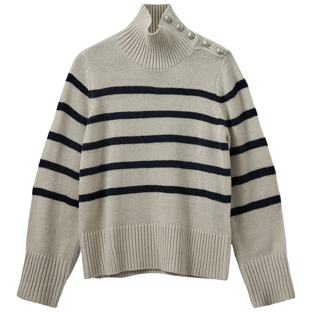 Ultra komfortabel Margaret strik designet med fine knapdetaljer og horisontalle striber
