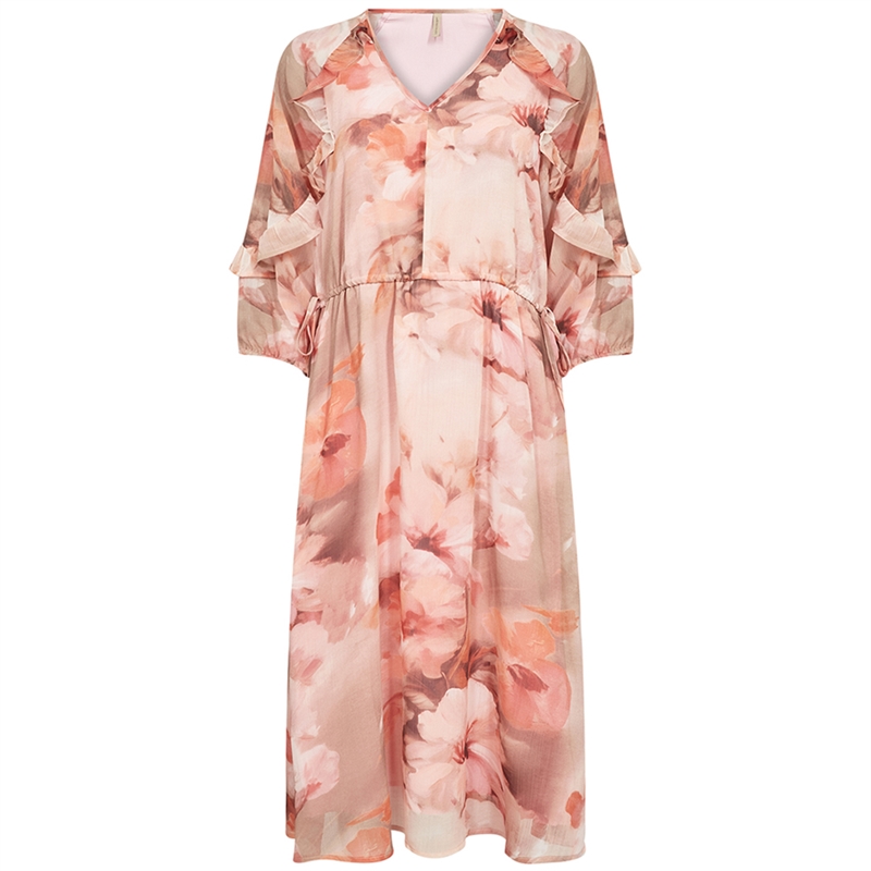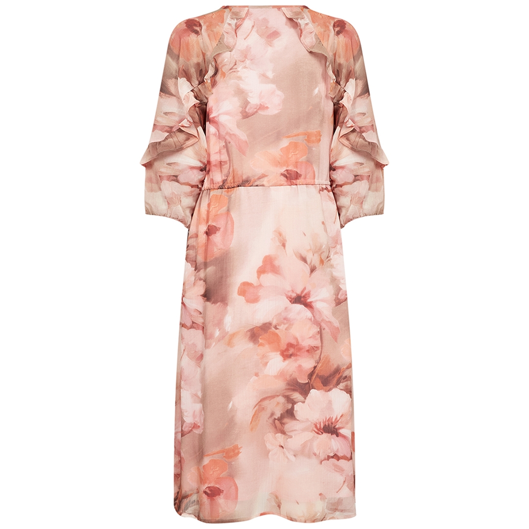 Flatterende Carmen 2 kjole designet med smukke flæser på ærmerne og fint blomsterprint