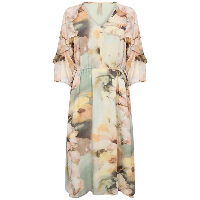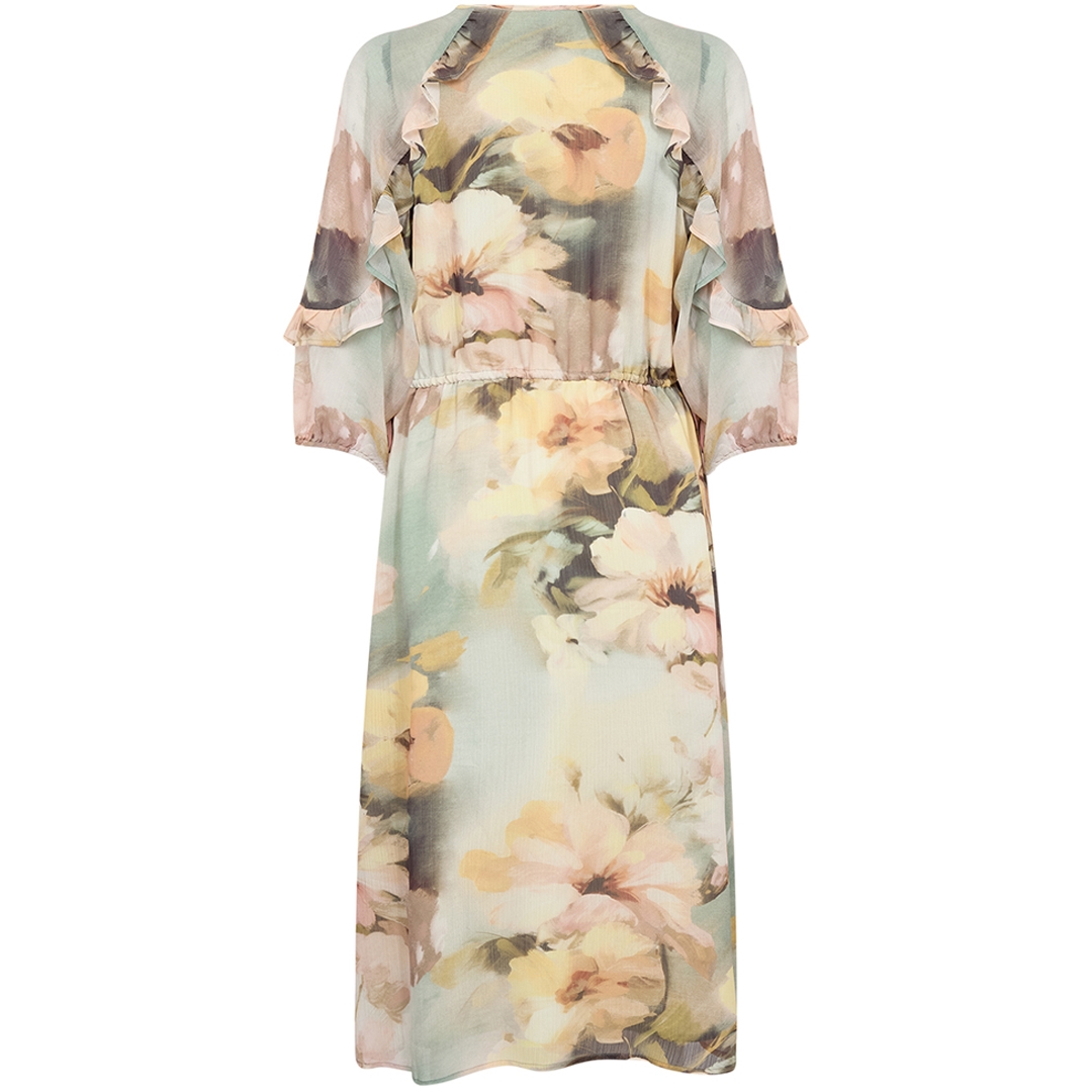 Flatterende Carmen 2 kjole designet med smukke flæser på ærmerne og fint blomsterprint